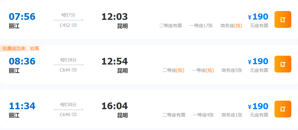 从丽江至昆明出发时查询的火车票价格最低为190元。