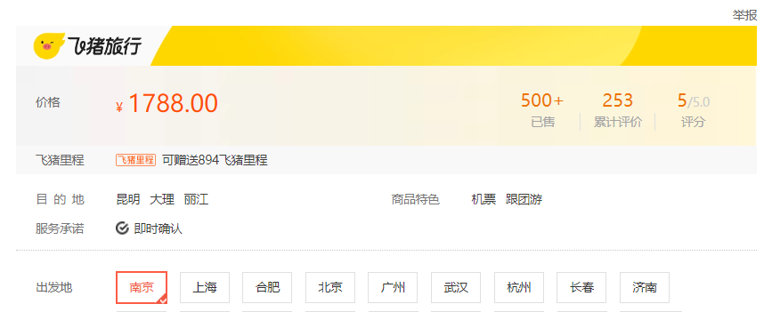2024年4月10日,云南省文化和旅游厅综合执法监督局联合文旅头条新闻网游舆大数据中心监测到:飞猪旅游网“北京山河壮美国旅专营店”云南旅游报团包机票昆明大理丽江西双版纳6天5晚跟团游旅行套餐