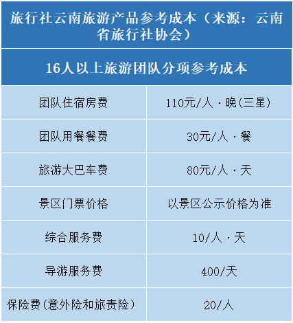 线路成本参考价/人=星级房价/人×入住天数+团队餐价/人×用餐次数+A级旅游景区门票价格/人+用车费/人×用车天数+综合服务费/人×出游天数+导游服务费/人×出游天数+保险费