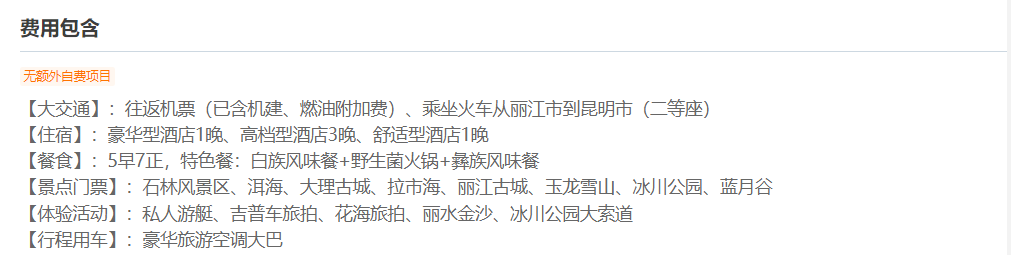 此行程包含往返机票、住宿、餐饮、景区门票、云南省内交通等费用