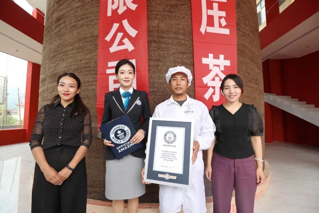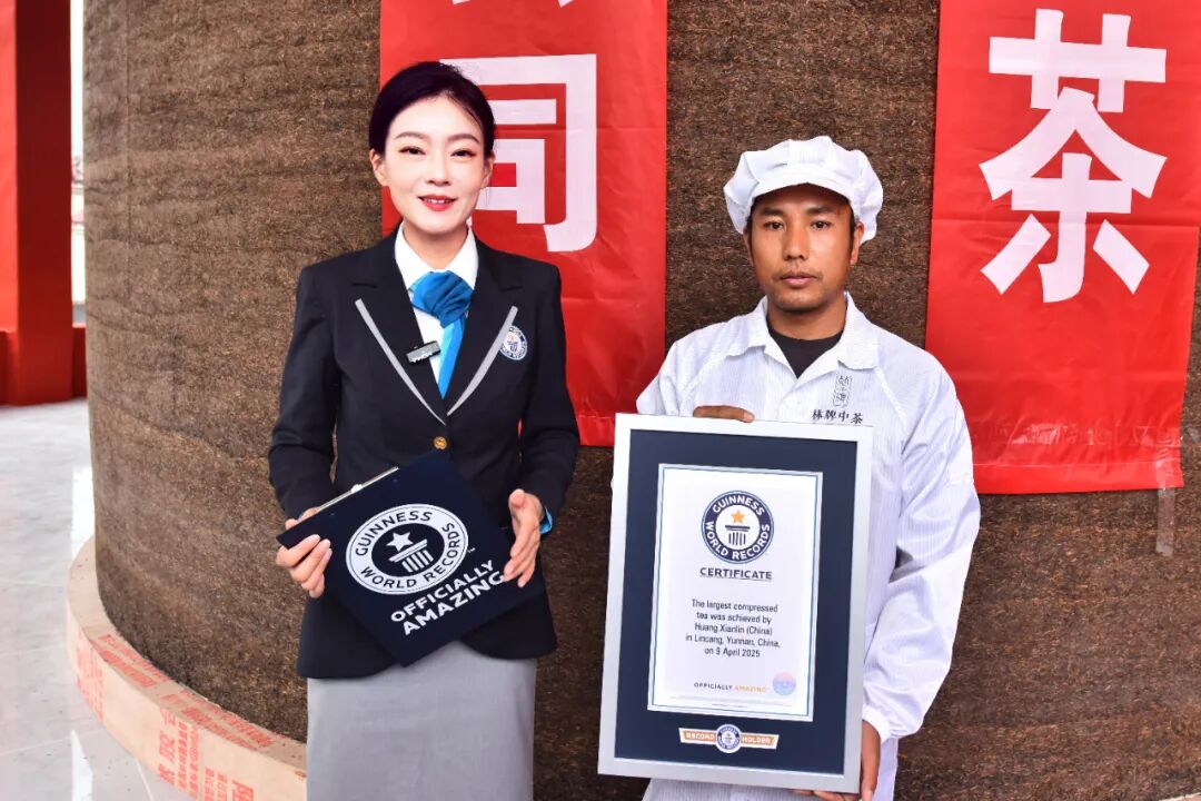 4月9日上午,临沧市临翔区凤翔街道昔本村赵家小山组沸腾如潮!随着吉尼斯世界纪录认证官侯颖郑重宣布:“挑战成功!”一座高达6.6米、重达150.71吨的巨型茶柱傲然矗立,以磅礴之势刷新世界纪录,成为全球瞩目的“最大紧压茶”!这一刻,临沧茶人用五年心血,在世界茶文化史上刻下浓墨重彩的“临翔坐标”。