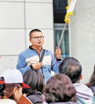 图为4月13日,陈飞碟在河口口岸为越南旅游团游客介绍中国风土人情。