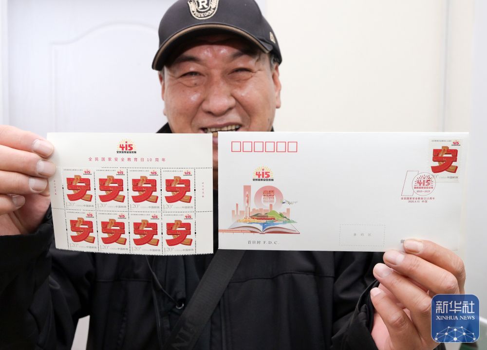 4月15日,邮迷在北京市西城区集邮营业厅展示《全民国家安全教育日10周年》纪念邮票和首日封。