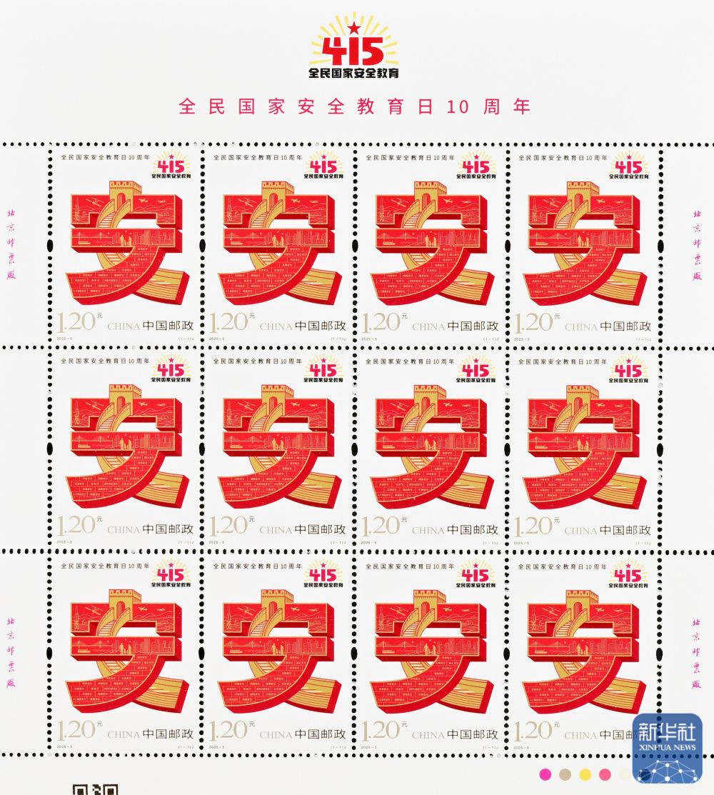 4月15日,中国邮政发行《全民国家安全教育日10周年》纪念邮票1套1枚,邮票图案名称为:全民国家安全教育日10周年。邮票图案以汉字“安”与安居乐业的人民、意象化的长城、城乡建筑、麦穗、火箭、飞机、高铁等元素进行同构设计,结合全民国家安全教育标识图案,体现出大安全理念和国家安全教育主题。