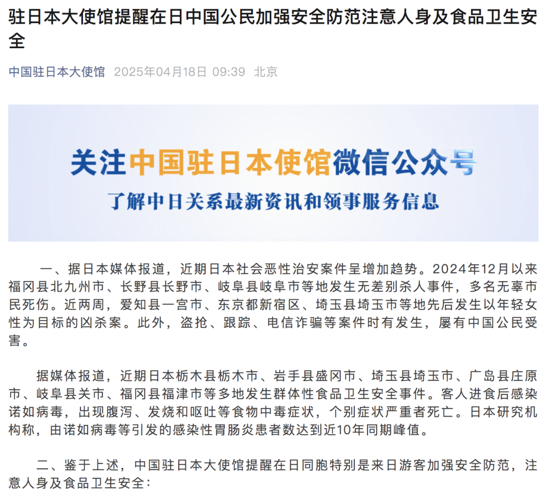 4月17日,驻日本大使馆发文提醒在日同胞及来日游客提高安全意识,注意饮食卫生,做好行前准备。