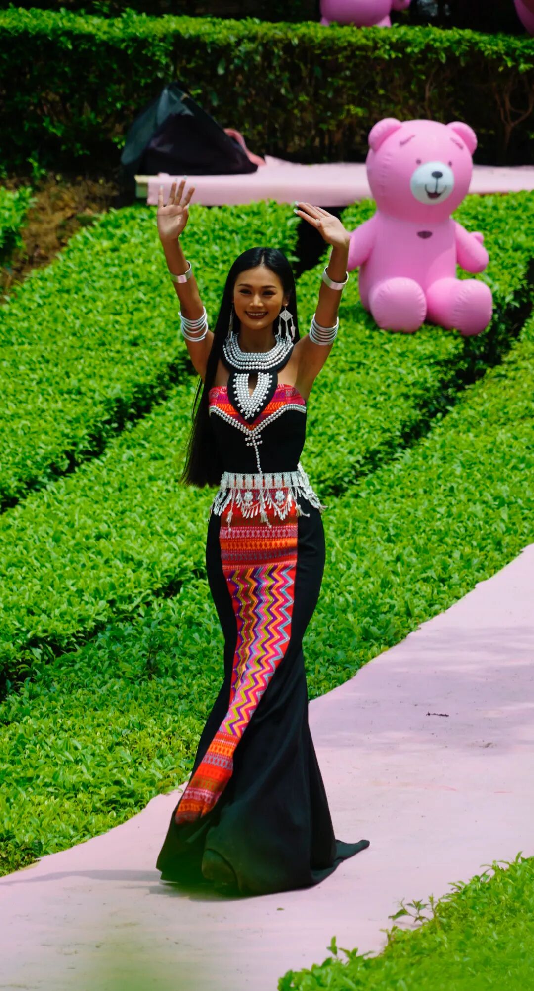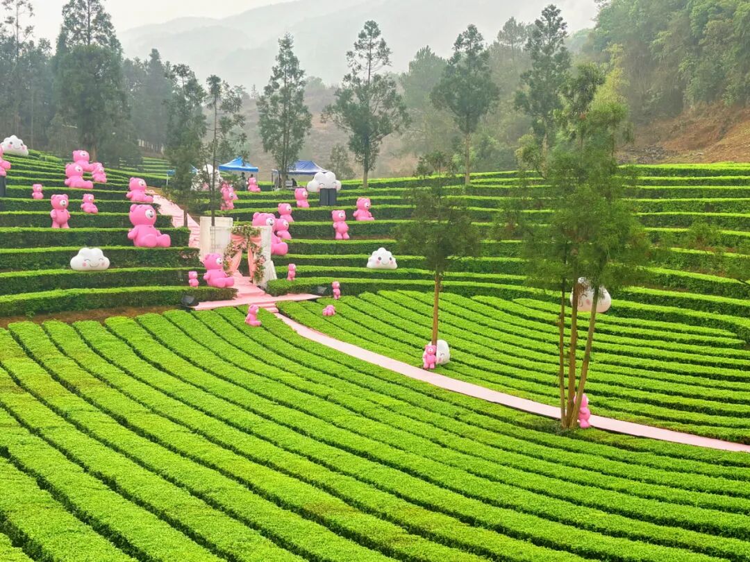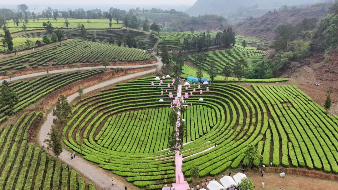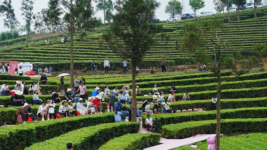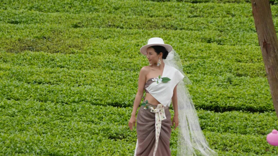 11时30分,茶园T台迎来高光时刻——“湄澜之畔·茶香霓裳”民族服饰秀惊艳登场。新锐设计师以茶叶为手环、茶染为裳,将临沧多民族图腾化为流动的时尚语言。模特手持中山竹编包,踏着茶园粉色地毯的天然T台款款而行,衣袂翻飞间,茶文化与民族美学浑然一体。网红模特鸟木、依久、黑美人、刘少以一袭“茶香民族风”造型引爆全场,记者和游客们纷纷举起手机记录这一“茶山时尚时刻”。