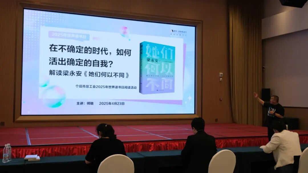阅读为舟,对话为桨。授课老师师兢用问答的形式,将《她们何以不同》中52问娓娓道来,恰如春雷惊蛰重塑着广大职工的精神图谱。群团联盟成员职工代表所朗诵的《奋斗青春要担当》,以铿锵之声串联起各自领域的模范故事;2024年市级职工书屋示范单位代表个旧市医保局演绎的情景剧《遇见》,跨越时空与李清照、张爱玲、杨绛深谈,赠女子箴言、予青年忠告、掘读书意义,用笔墨撕开生活褶皱,让大家在字里行间遇见自己。