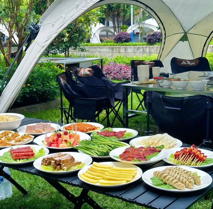 我们的烧烤区,被葱郁的树木环绕,夜晚时分,星光点点,微风拂面,营造出一种远离尘嚣、亲近自然的用餐氛围。