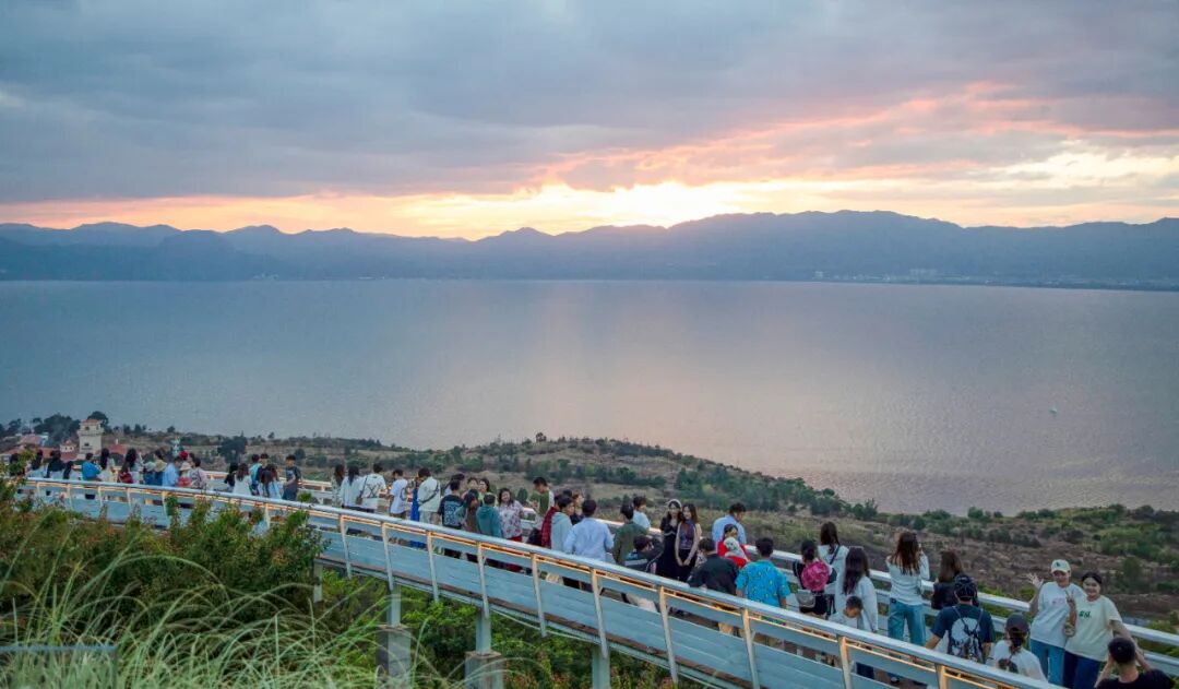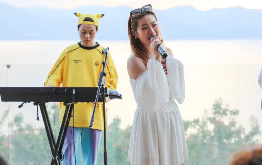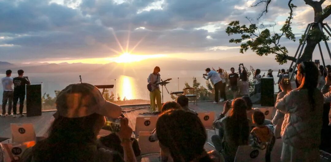而在自在汐岸,一场落日音乐节正点燃假日激情。当夕阳将湖面染成金色,舞台上的乐队用动感旋律与湖畔美景交织,游客们或随节奏摇摆,或在湖风与音乐中举杯畅聊,沉浸式体验“音乐+自然”的独特魅力,为澄江之旅增添浪漫难忘的回忆。游客简丹说:“看着日落,听着演唱会非常地享受、惬意。”