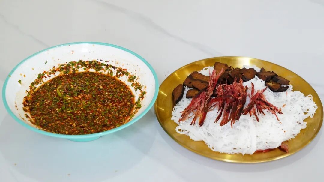 凉拌驴皮是可以吃的非遗传统技艺,选用本地黑毛驴皮,经烫、烧、煮、压等工序制成,口感筋道,搭配小米辣、水豆豉等调料,糯滑清爽与麻辣酸爽融合,层次丰富,香而不腻。