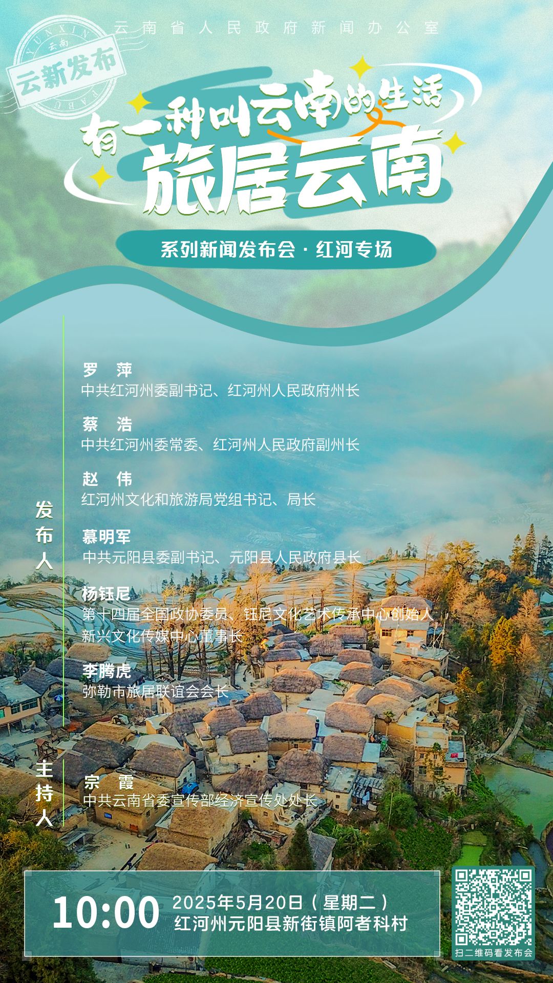 5月20日上午10:00,“有一种叫云南的生活·旅居云南”系列新闻发布会红河专场将在红河州元阳县阿者科村举行,邀您共同见证,云南红河如何以山水为媒、文化为魂,打造旅居时代的心灵栖息地。