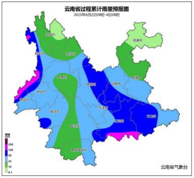 6月2日:曲靖市南部、昆明市、楚雄州东部、丽江市南部、玉溪市东部、文山州、红河州东部、怒江州、大理州北部、保山市、德宏州、临沧市阴有中到大雨局部暴雨、大暴雨,其他地区多云间阴有阵雨局部中雨。