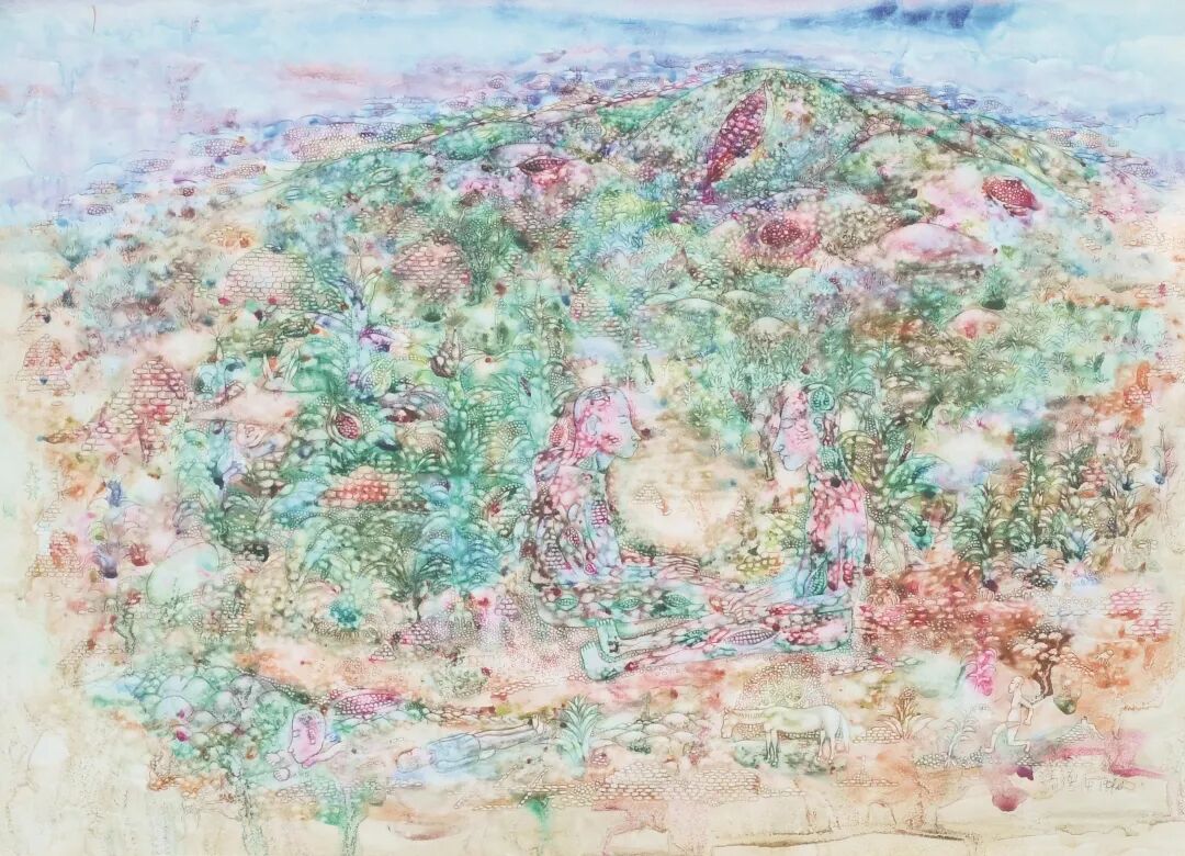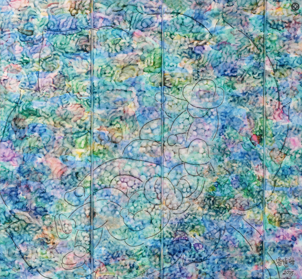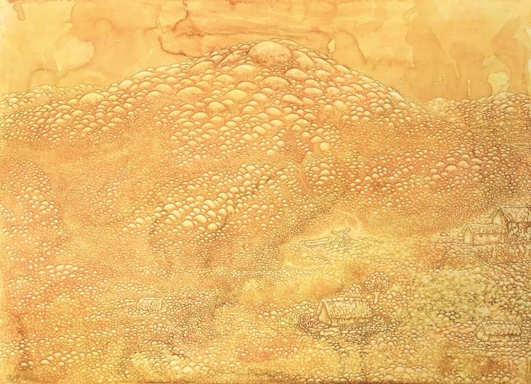 作为 “85新潮美术” 的标志性艺术家,潘德海创作带有前卫精神的抽象表现主义作品,描绘具有生命张力的大地诗篇。1989年 “中国现代艺术展” 中,潘德海的作品《掰开的苞米 —— 后山》(三联画)将苞米的自然形态转化为抽象表现形式,布满画面的颗粒状苞米符号超越具象描绘,成为构成生命的抽象细胞。这些布满画面的颗粒状苞米符号传达了艺术家自由创作的意图和思想,作品在展览中广受好评。苞米系列始于1987年,艺术家从洗掉一张不满意的水彩残留的颗粒效果中获得灵感,也是他在土林系列中提炼绘画语言的结果。这些微小而坚韧的元素成为了探索生命本质的视觉密码。这也标志着艺术家由抽象表现主义《土林》系列顺利地过渡到了带有超现实主义绘画特征的创作领地。这些来自现实也来自幻觉和空想的“苞米人”成为中国当代艺术中极具辨识度的符号,展现出艺术家对生命本质的深刻探索。
