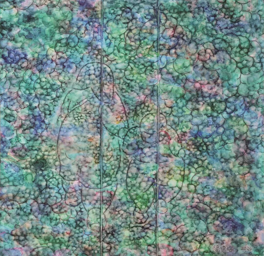 2020年前后,科技发展与疫情改变了社会背景,潘德海的艺术语言和创作母体也发生质性蜕变,创作方向和艺术风格多元拓展。2022年始创作的《假期》系列和《每一天》系列延续此前色彩鲜艳的风格,描绘家庭生活和儿童世界。潘德海以艺术视觉折射疫情后的社会心理,在对生活范式的呈现中,叩问自由精神与个性价值的追寻,流露出对年轻下一代的担忧。他的纸本作品展现出清新面貌,形式简化,颗粒符号不再过强调,更多地运用流动的线条,如《人间戏剧》《假日》《岁月》等;而《背景》《假日》《小普陀》等作品则以密集颗粒布满画面,让观者感受像看三维立体画,艺术家不再强调空间塑造,而是着重意象传达。与此同时,艺术家还进行着抽象作品的创作,过去突出重量的具象人物形体转向轻灵表达,人物形象在光影中模糊,似岁月印记。正在进行的一幅纯抽象作品,人形已经消失,圆弧符号叠加串联,圆形脱离具体所指的约束,成为纯粹的精神内驱力的表征,是旺盛生命力的图腾。无论时代如何变迁,潘德海始终围绕人的精神原乡,沉迷于生命的哲思,用独特艺术语言寻找人的本质及其生存意义。