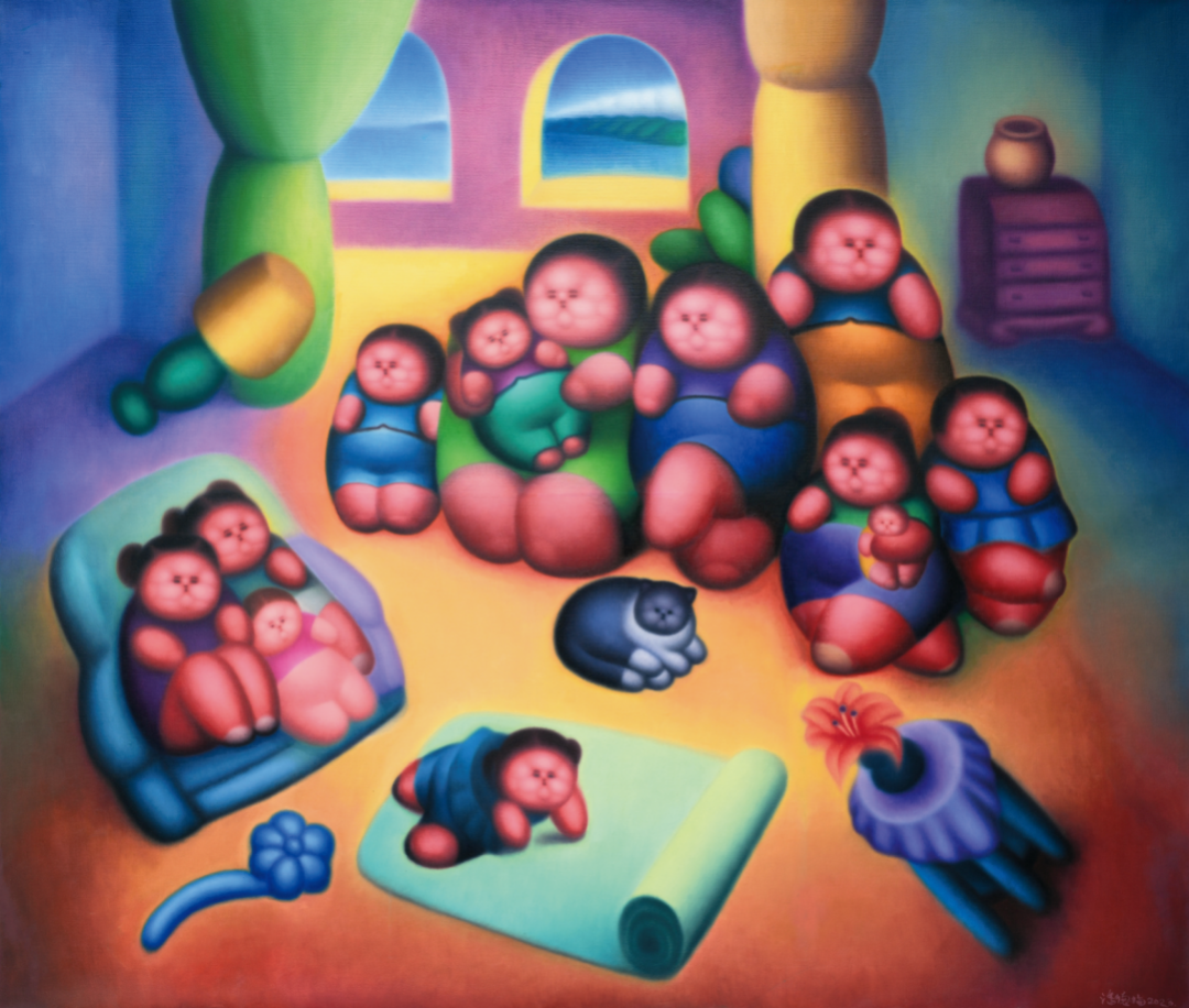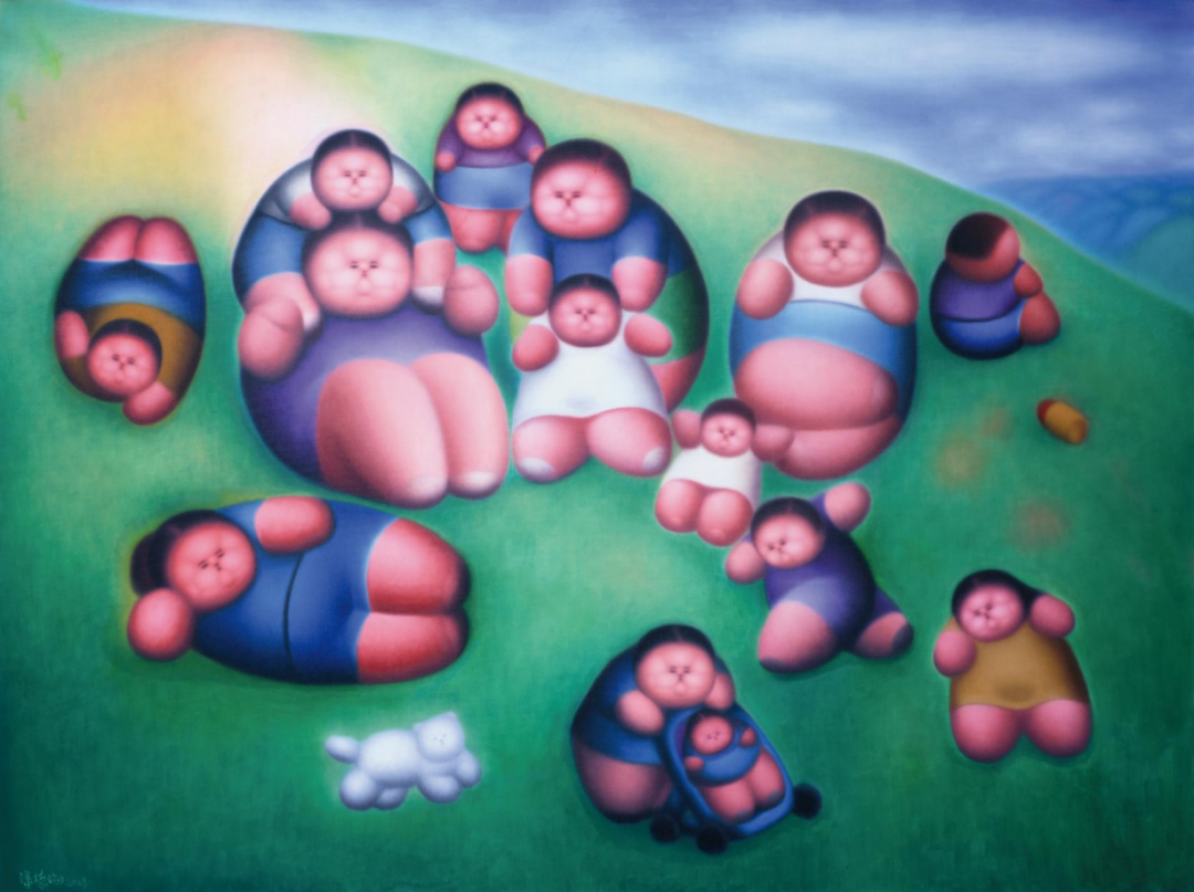 2000年,潘德海回归昆明,在创库艺术社区设立工作室,这一时期创作的作品具有极大的转变:视觉语言变得冷峻沉郁,人物完全剥离背景环境,仅以肥胖躯体构成画面主体;符号也进一步强化,玉米粒升华为人体肌肤的圆形高光质感,形成独特视觉肌理。此阶段的创作不再局限于个体经验的表达,而是将视角转向更广阔的社会层面,画面中简洁的构图与强烈的符号对比,凸显出艺术家对社会现实的敏锐洞察与深刻反思。
