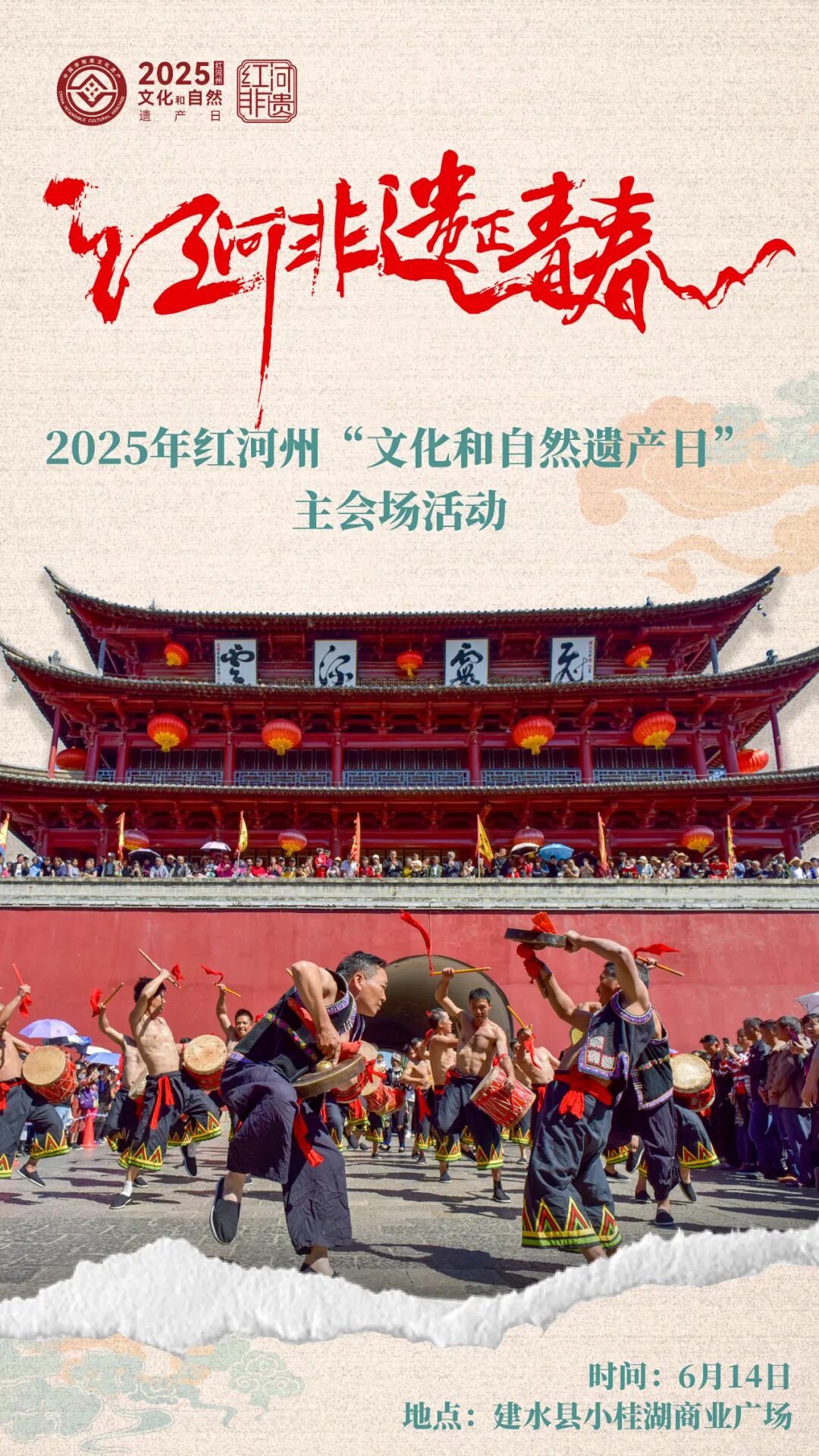 活动内容:2025年红河州“文化和自然遗产日”主会场活动暨民间歌舞乐展演启动仪式,非遗街区沉浸式演艺、民族民间歌舞乐展演齐上!