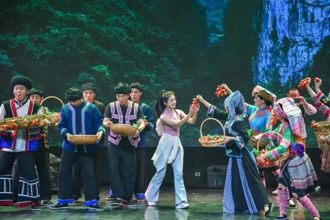 《人字桥边是故乡》从一位苗族女孩陶思屏展开,共分为“故人”“故事”“故土”“故乡”四幕,场景伴随故事的进程衔接转换,灯光、音效与多媒体技术巧妙融合,演员们每一个眼神的交汇、每一次细微的动作、每一句饱含深情的台词,都倾注了他们对角色的深刻理解和对艺术的执着追求。(来源 苗乡屏边)
