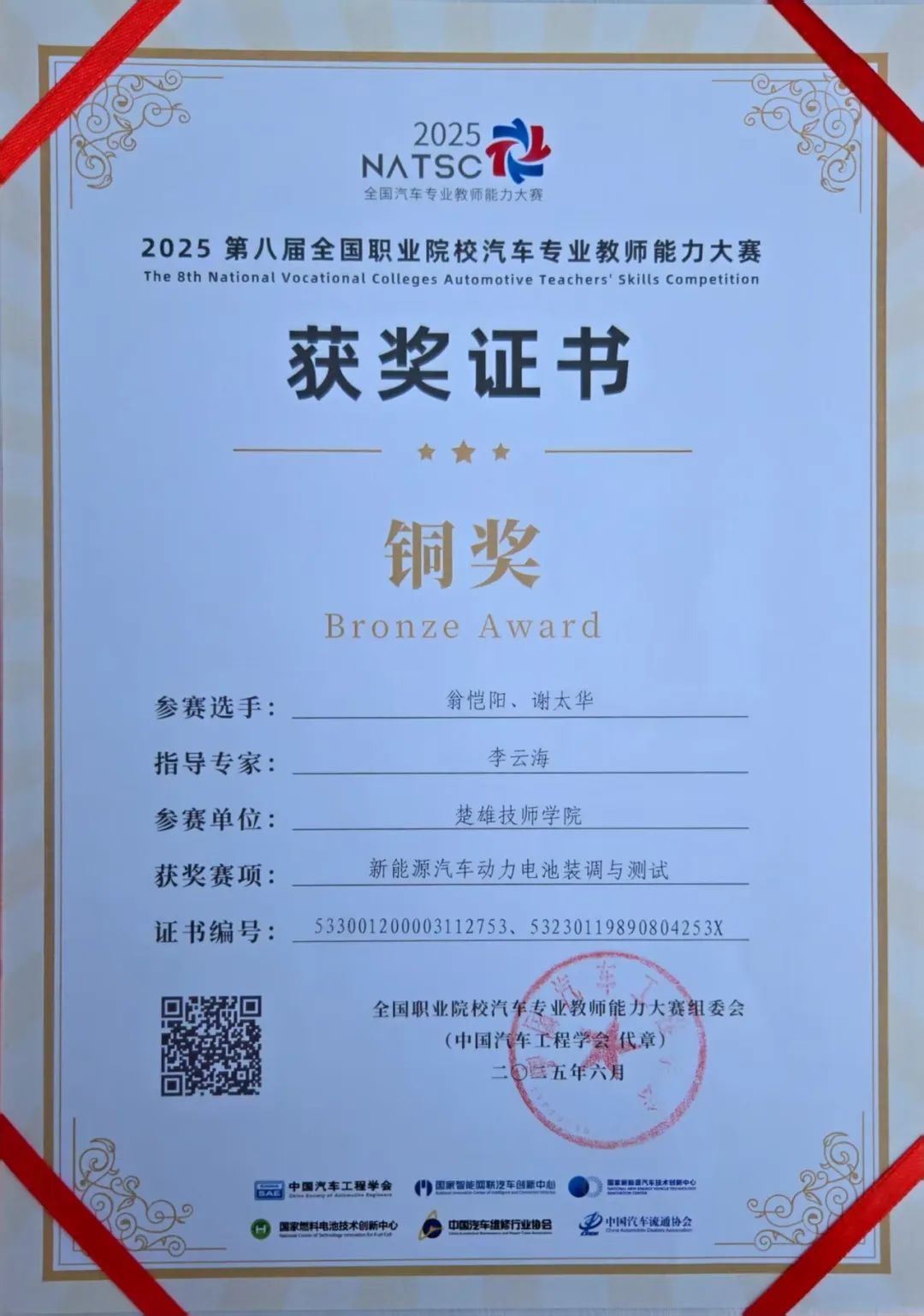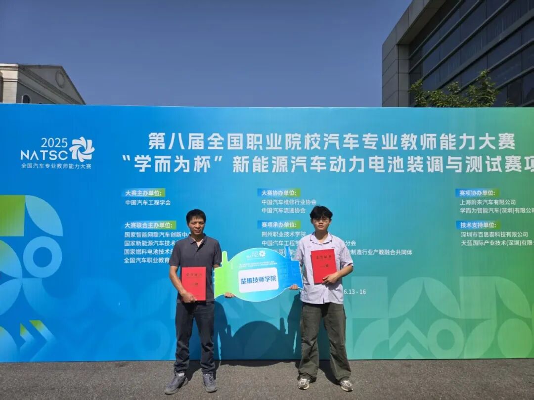 6月13日至16日,第八届全国职业院校汽车专业教师能力大赛“学而为杯”新能源汽车动力电池装调与测试赛项在荆州职业技术学院举办。翁恺阳、谢太华代表楚雄技师学院和来自全国21个省份46支高职队伍同台竞技,我院参赛教师凭借扎实的专业功底、精湛的操作技能和出色的临场发挥,经过层层比拼,最终荣获全国铜奖!