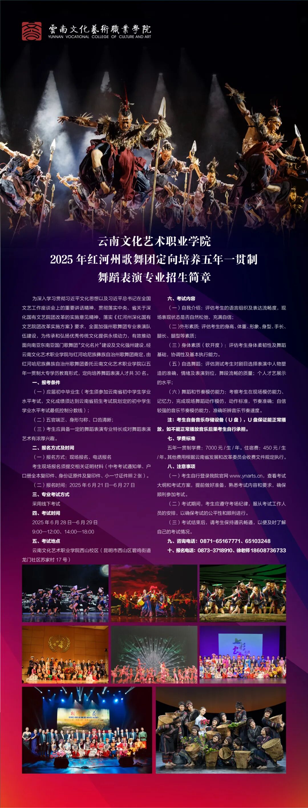 招生考试相关内容详情详见附件《云南文化艺术职业学院2025年红河州歌舞团定向培养五年一贯制舞蹈表演专业招生简章》。