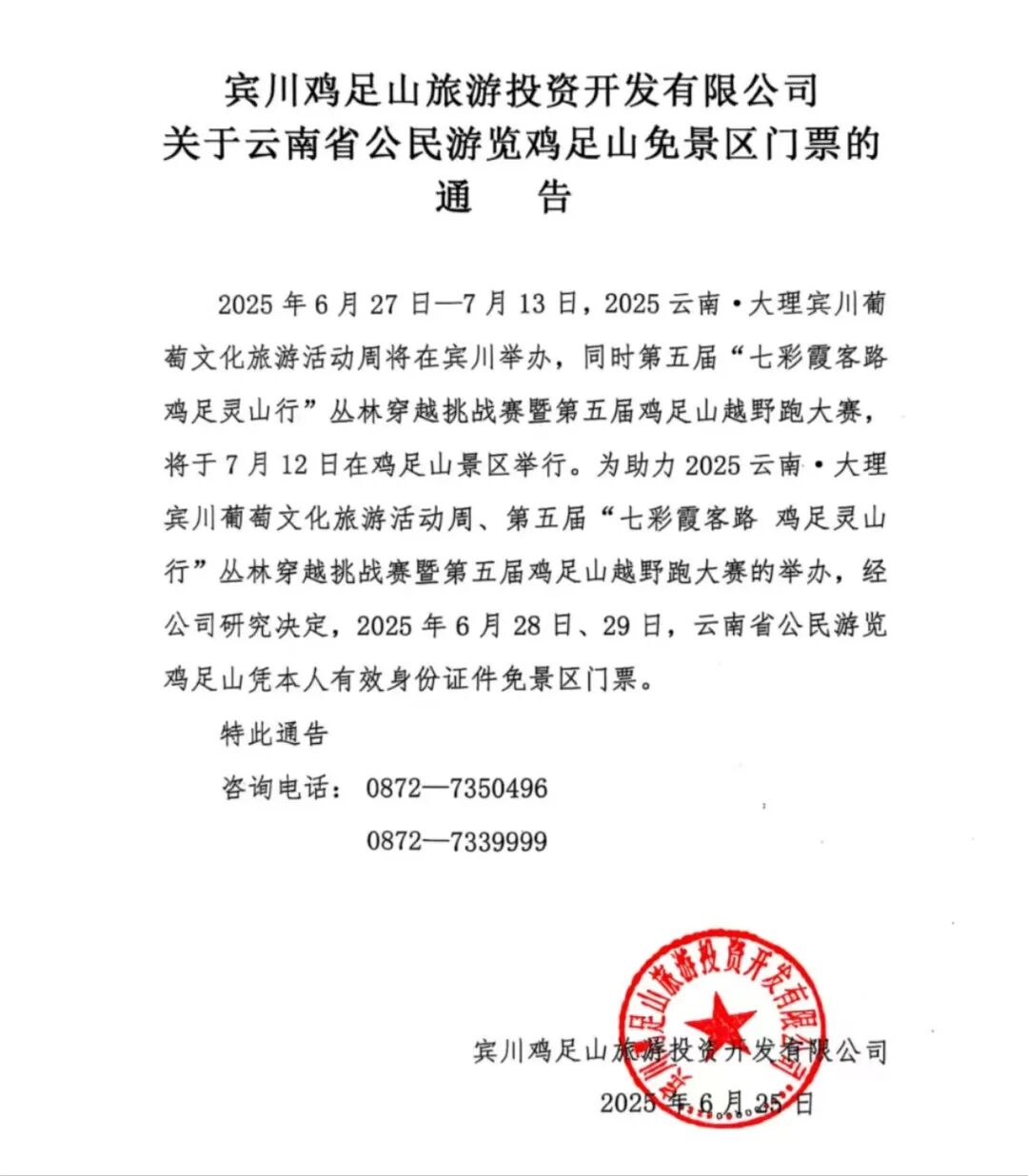 2025年6月28日、29日,云南省公民游览鸡足山凭本人有效身份证件免景区门票。