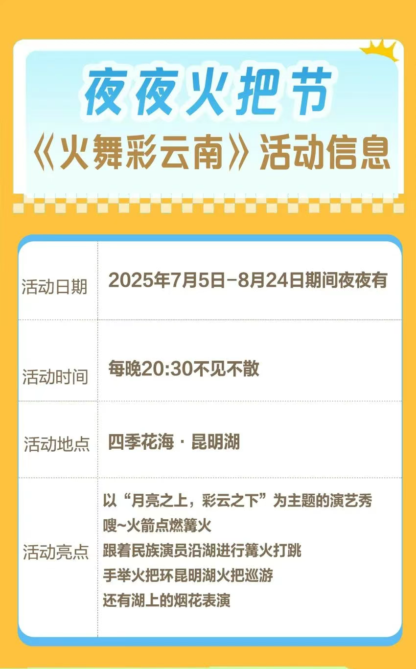 夜夜火把节:演艺秀+篝火打跳+火把巡游+烟花表演。