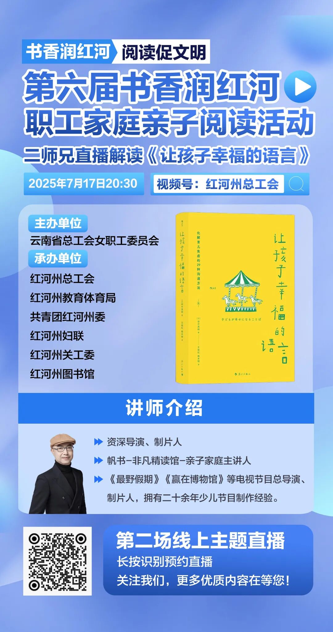 这次,红河州总工会、红河州教育体育局、共青团红河州委、红河州妇女联合会、红河州关心下一代工作委员会、红河州图书馆特别邀请到资深导演、亲子教育专家“二师兄”,深度解析《让孩子幸福的语言》,通过剖析错误沟通的危害,对比29种育儿场景的语言模式,拆解鼓励式沟通的底层逻辑,帮助家长缓解焦虑,用温暖语言滋养孩子成长,打造和谐幸福的家庭关系。