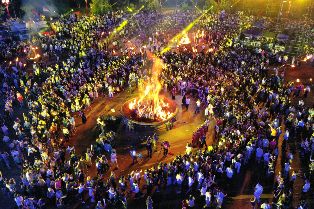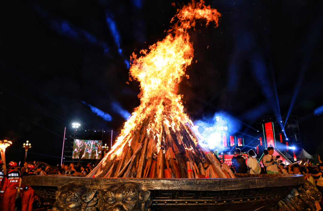 夜幕降临,重头戏祭火仪式在《火之礼赞》中进行,请火神、取火种、祭火神、传火把等仪式庄严进行,彝族同胞通过传统仪式表达对火的崇敬、对美好生活的向往。点火仪式把活动推向高潮,圣火点燃,熊熊火焰照亮夜空,舞蹈《欢乐的节日》、绚丽的焰火表演以及欢快的左脚舞狂欢,让全场陷入欢乐的海洋,人们手拉手,围着篝火载歌载舞,尽情释放喜悦。