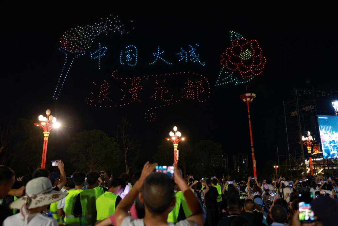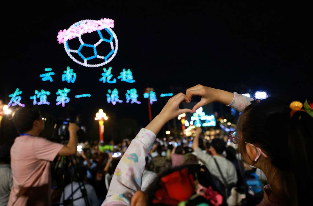 在迎宾演出后,舞蹈《祭火》为火的盛典揭开序章。紧接着,歌舞《弹起弦子跳脚来》《颂火》让现场观众感受到火把节里最热情的祝福。配合着歌曲《火之歌》,千架无人机升空编队展示,在夜空中组成各种绚丽图案,与舞台上的表演交相辉映,给现场观众带来视觉与听觉的双重震撼。