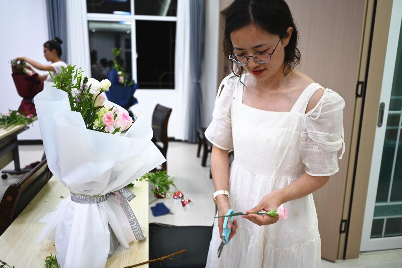 进入实操环节,职工们迫不及待地拿起花材投入创作。大家先仔细挑选心仪的花叶,有的偏爱热烈的红玫瑰,有的钟情淡雅的满天星,随后按照学到的技巧修剪、搭配、固定。原本略显拘谨的现场逐渐热闹起来,有人互相请教花材摆放位置,有人分享自己的创意构思,剪刀轻响与欢声笑语交织成和谐的乐章。