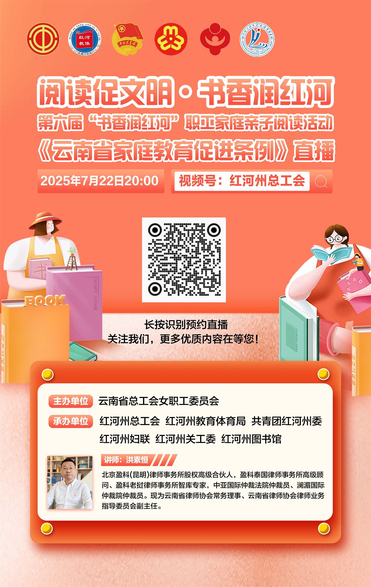 为帮助家长树立良好家风,履行家庭教育责任,为各地开展阅读活动搭建交流平台,第六届“书香润红河”职工家庭亲子阅读活动《云南省家庭教育促进条例》专题直播讲座特邀北京盈科(昆明)律师事务所资深律师洪素恒担任主讲。