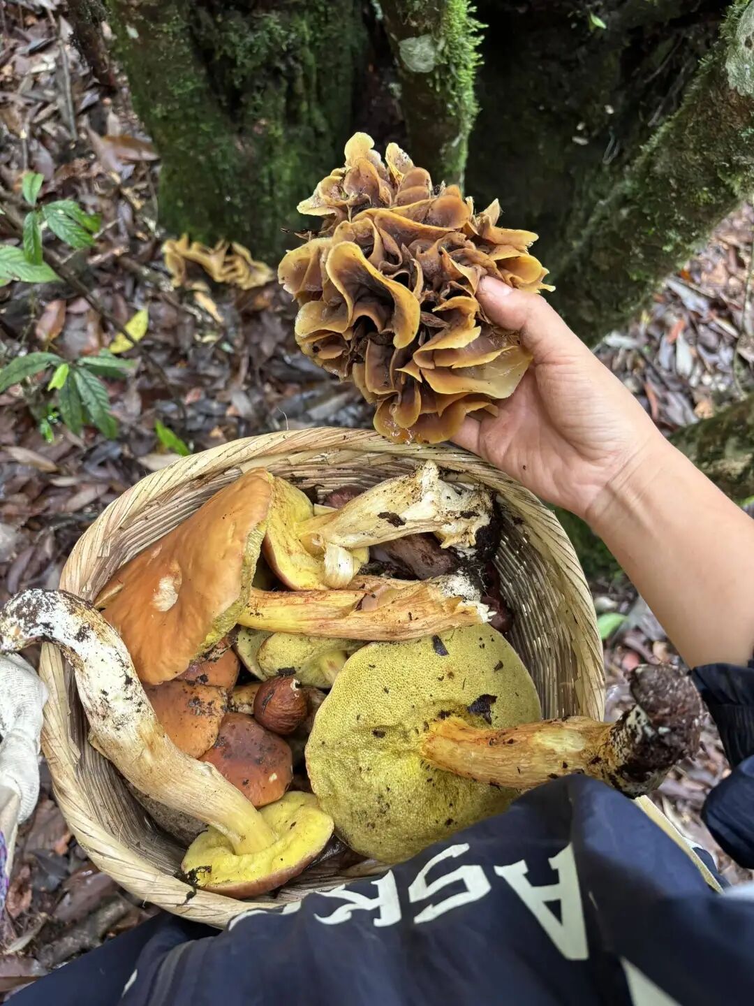 线路三:七彩坡。这里不仅能找到常见的牛肝菌、青头菌,运气好的话,还能邂逅珍贵的鸡油菌;打马坎也有不少谷熟菌、兔腰子菌等;三棵树周边亚洲小牛肝尤为常见。