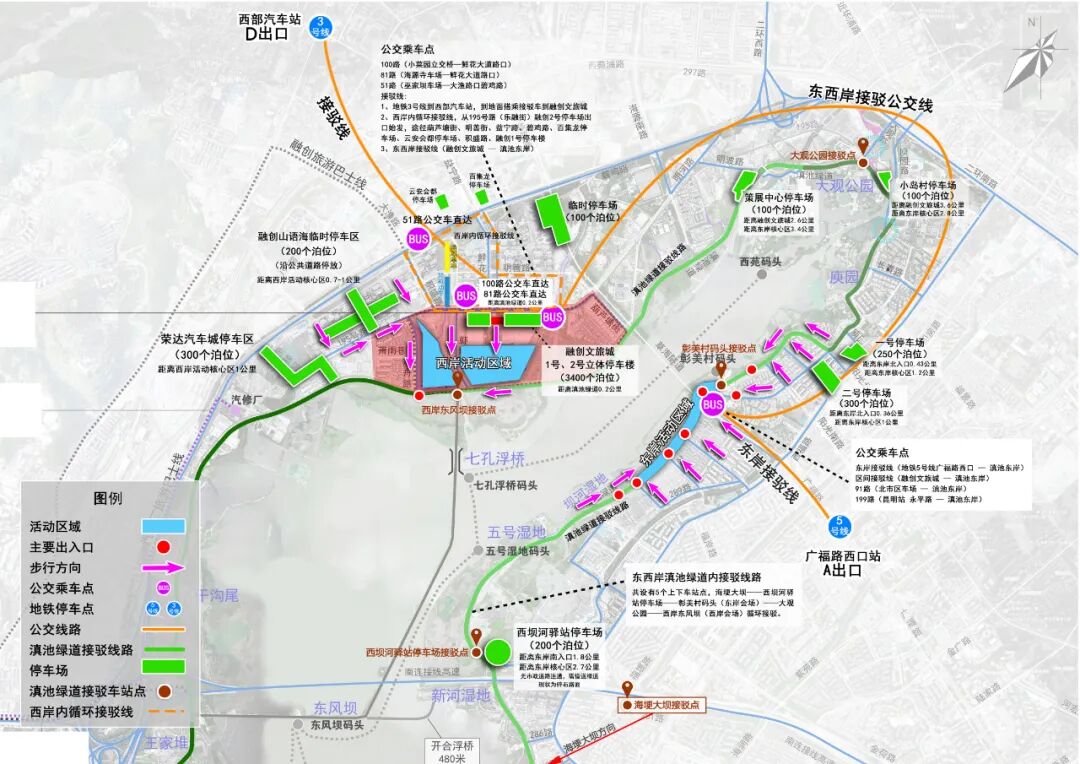 碧鸡路百集龙停车场、云安会都停车场、临时停车场等百余个停车场,距离西岸活动核心区2公里。