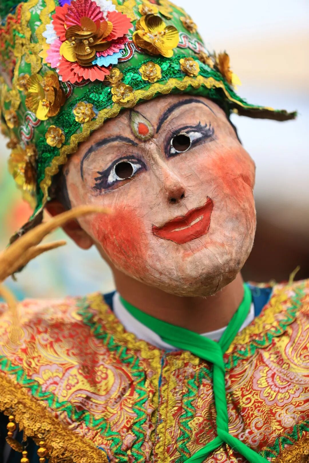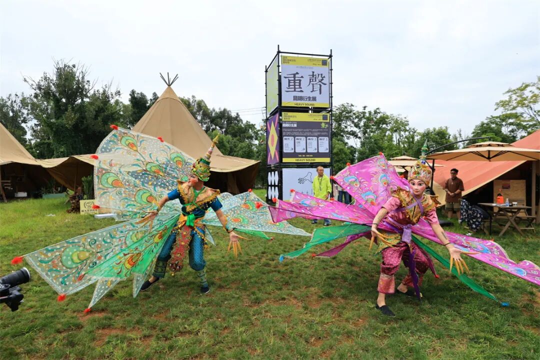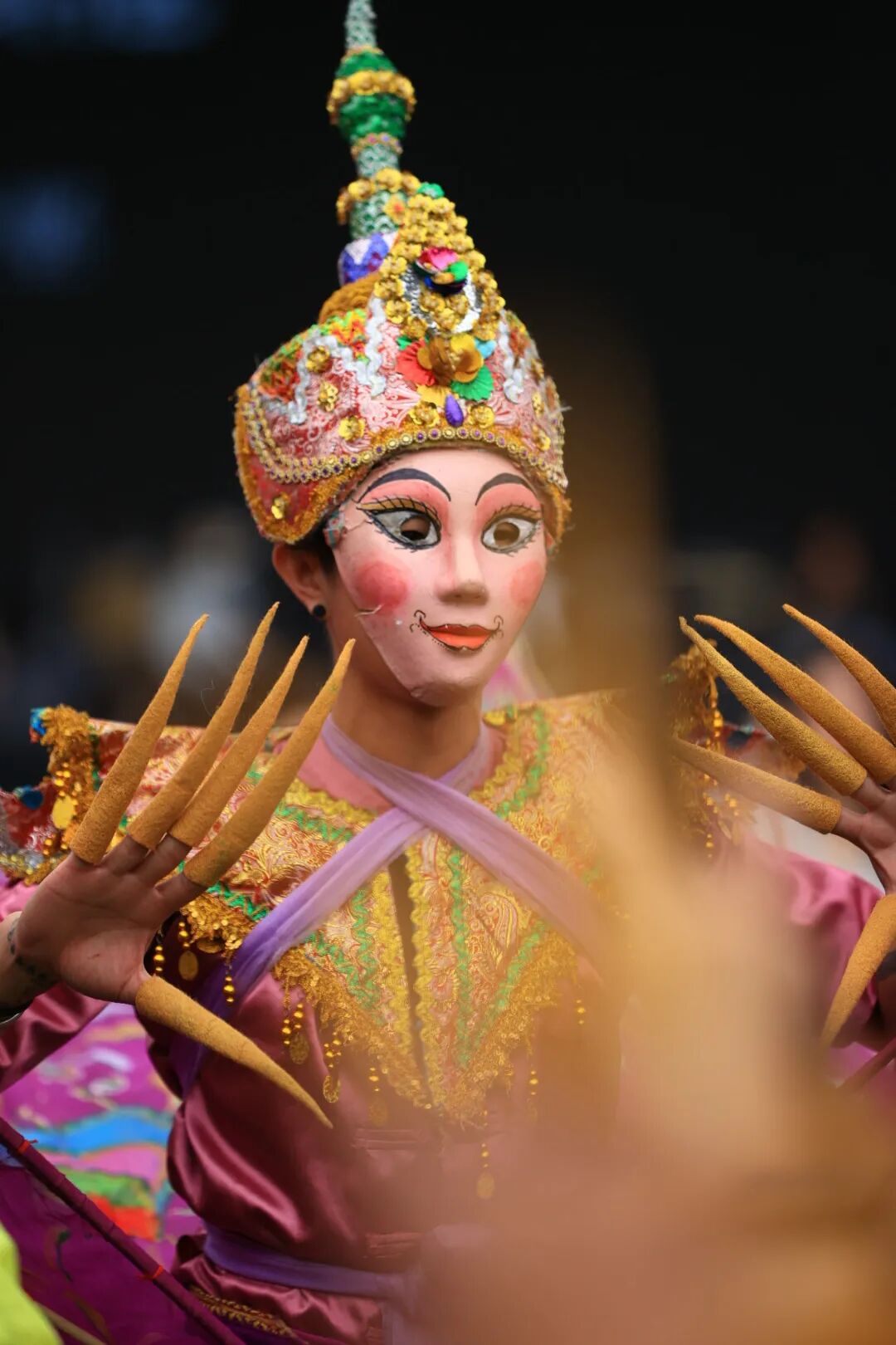 开街启动仪式现场,省级非遗项目傣族神鸟舞率先登场,瞬间吸引了所有人的目光。两位非遗代表性传承人佩戴镂刻祥云的金冠面具,身披华丽的翘肩华服,背负竹制鸟形架,在悠扬的乐声中翩翩起舞。他们将鸟类的灵动姿态与傣族武术的刚劲完美融合,跪伏、抖翅、小跑等动作惟妙惟肖,生动再现了神话中雌雄双鸟的忠贞与生命力。