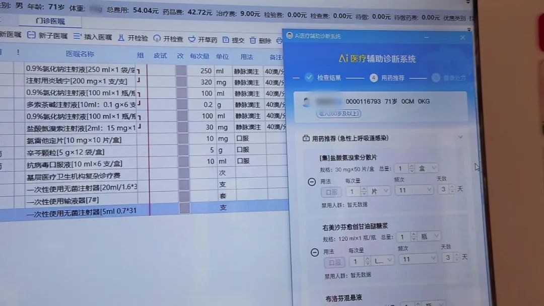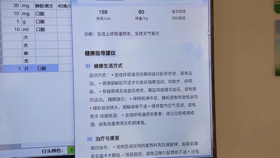 杨逍进一步介绍:“医生接诊患者后,只需填写相关信息,系统便会自动将这些信息传送给AI。AI会根据患者的身体状况,给出诊断建议和用药指导。诊疗结束后,AI还会根据患者情况提供营养建议,并生成健康处方。”