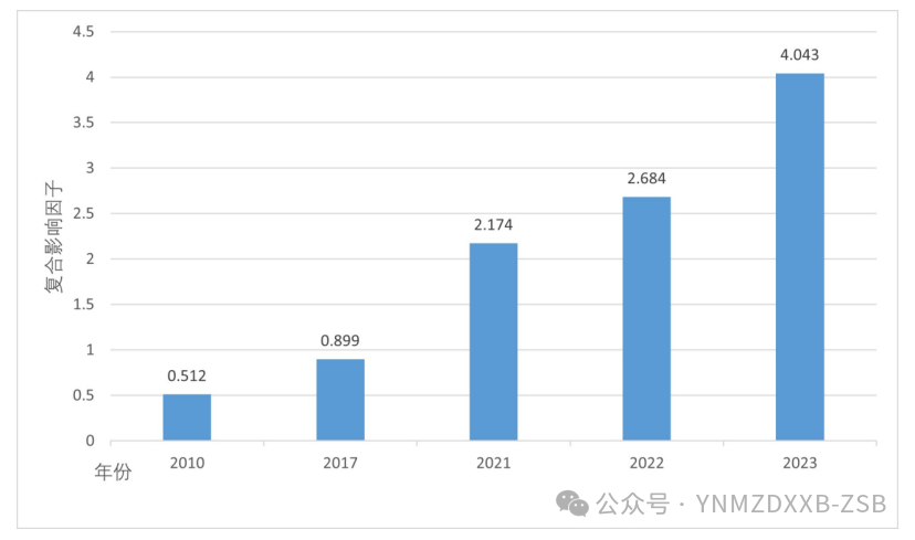 自创刊以来,《云南民族大学学报(哲学社会科学版)》办刊质量不断攀升,影响力不断扩大,复合影响因子总体上呈持续增长态势。《中国学术期刊影响因子年报(人文社会科学)》数据显示,2023年本刊复合影响因子突破“4.0”的关口;2024年,复合影响因子提升为4.541,综合影响因子提升至2.785。