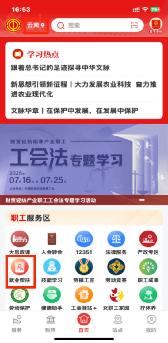 2.点击“首页”下拉到“职工群众服务区”点击“就业帮扶”
