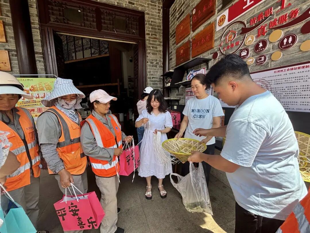 屏边县总工会慰问组先后来到工会驿站、民族初级中学建筑项目点、黄磷厂有限责任公司等单位,看望环卫工人、建筑工、高温车间职工及新就业形态劳动者共120人。工会负责人与职工亲切交流,详细了解工作强度和休息情况,叮嘱大家注意防暑降温、劳逸结合,强调工会始终是职工的坚强后盾和“娘家人”。现场发放了夏凉被、双层玻璃水杯、解暑药品等实用物资,为高温下的劳动者撑起“遮阳伞”。