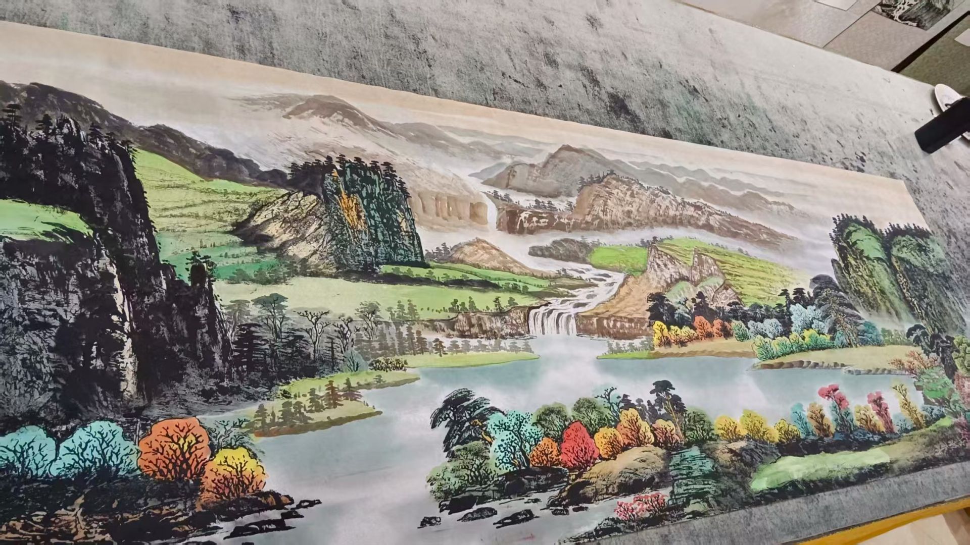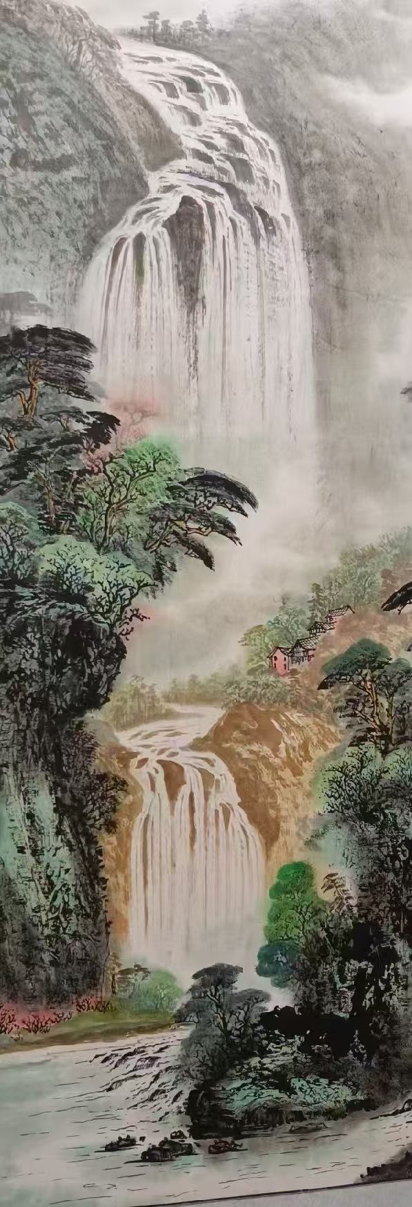 可喜的是,作为代表国礼的《晨露》画作,展现了李忠良艺术体系的另一面,这幅画作反映了其艺术创作的多样性和丰富性。这幅作品在延续“筋血皴”表现力度的同时,通过“喷洒清水”等创新技巧,营造出云雾氤氲、露气浸润的滋润之感,这种处理既保持了画面的力度,又增添了画面的韵味和层次。画面中,坚硬的岩石与流动的云雾形成强烈对比,完美诠释了“山是骨,雾是灵,水是魂”的理念,这种刚柔并济的处理方式,不仅是一种艺术手法,更是一种哲学表达,体现了东方文化中"阴阳相生"的宇宙观和自然观。