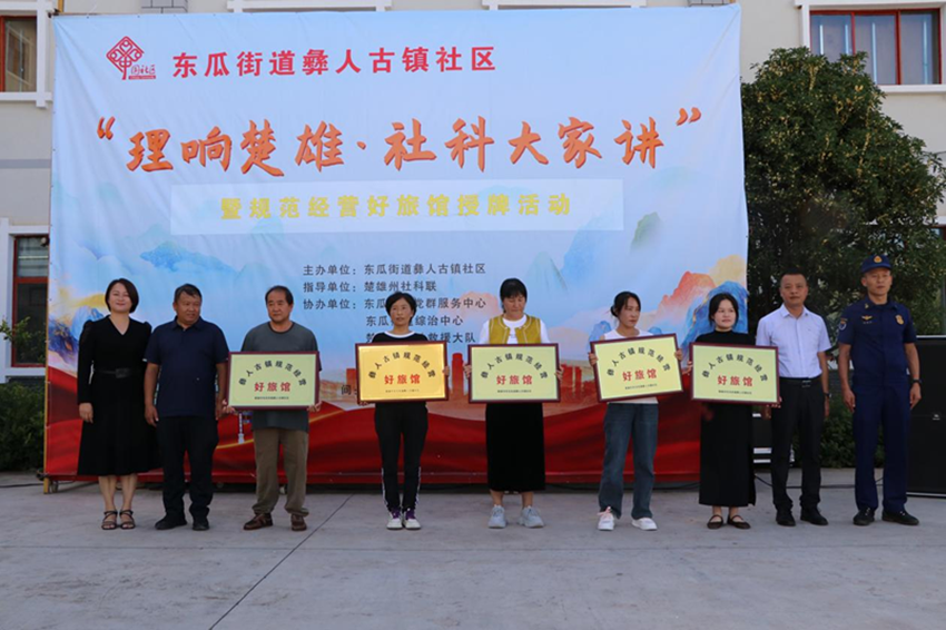 理论宣讲深入浅出,示范授牌树立标杆,文艺表演精彩纷呈……9月2日下午,一场别开生面的“理响楚雄·社科大家讲”暨彝人古镇社区规范经营好旅馆授牌活动在楚雄(高新区)零工市场内举行。活动由彝人古镇社区主办,旨在将党的创新理论与社科知识送至基层,探索以行业规范促进社区治理的新路径,构建共建共治共享新格局。