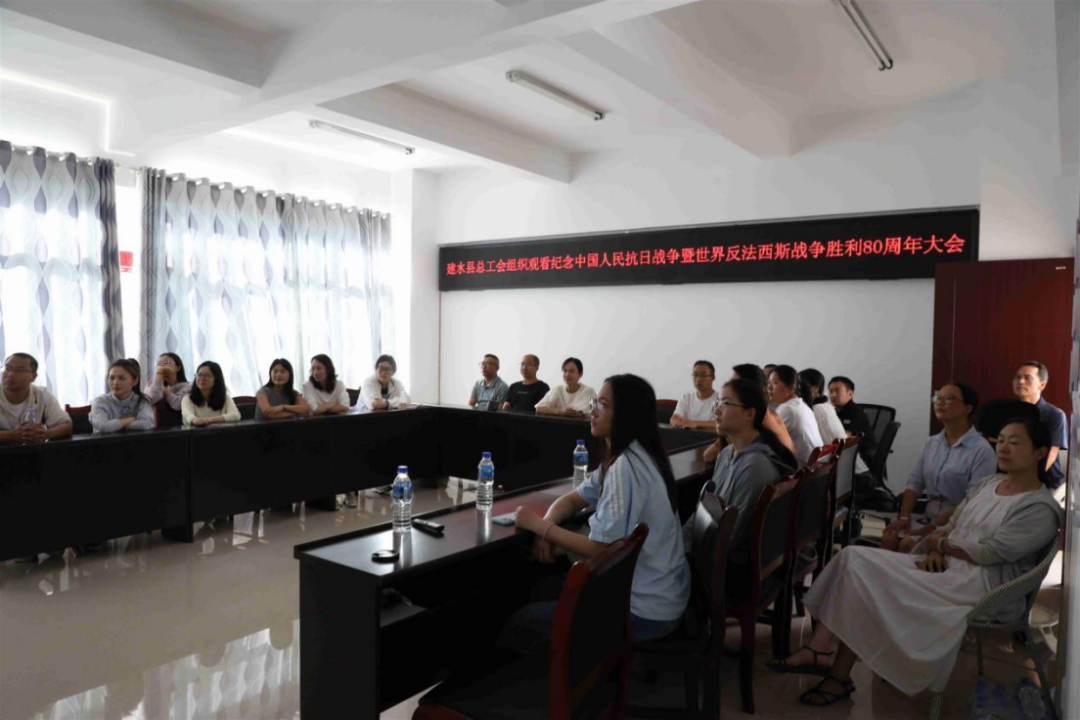 ▲建水县总工会组织干部职工集中观看纪念中国人民抗日战争暨世界反法西斯战争胜利80周年大会直播
