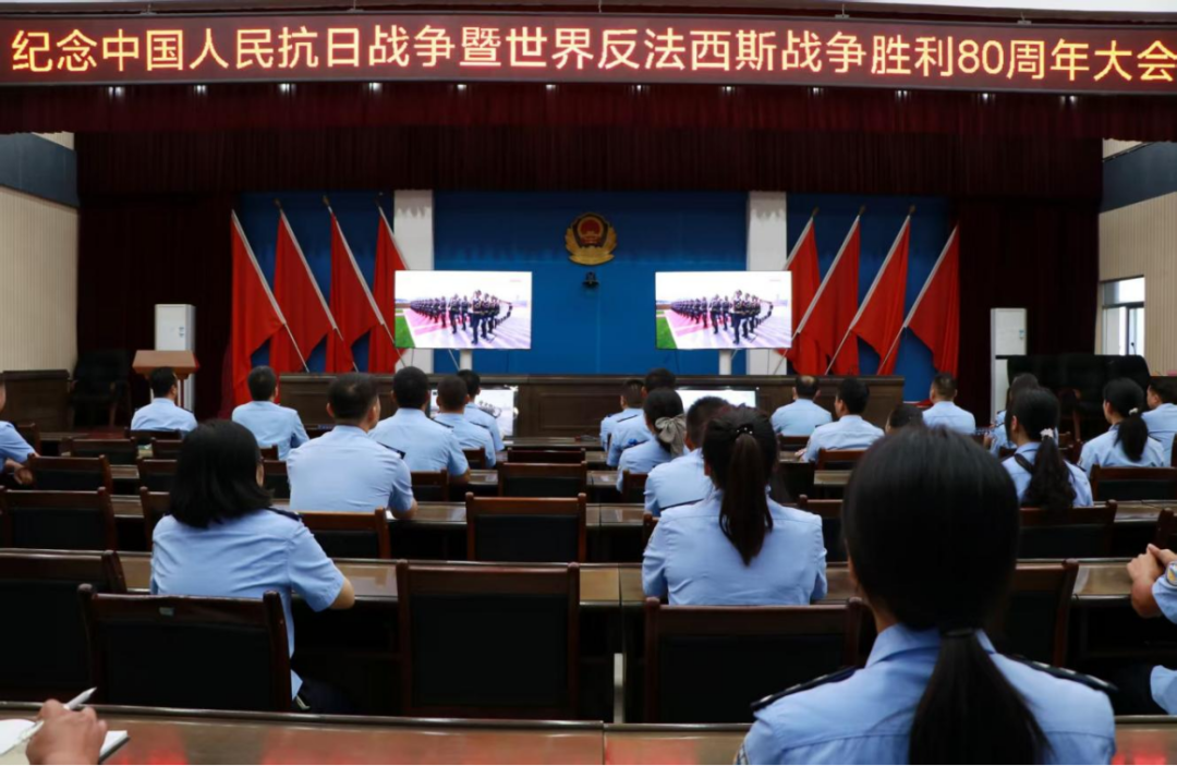 ▲石屏县群团联盟组织干部职工集中观看纪念中国人民抗日战争暨世界反法西斯战争胜利80周年大会直播