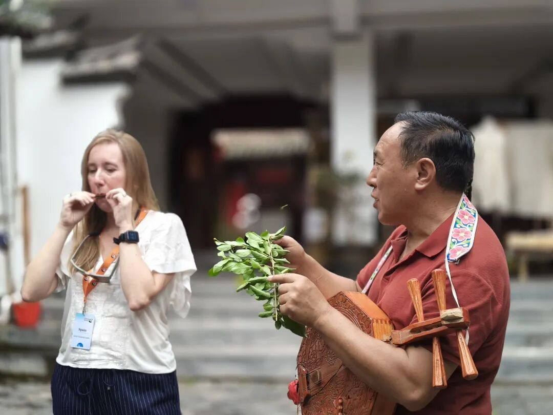 走进南街,采访团成员驻足观赏,聆听巍山彝族打歌省级非物质文化遗产代表性传承人、大理州民间艺人字汝民带来的树叶吹奏表演。一片寻常树叶在他指间化作“传情使者”,《大理三月好风光》《花儿开》等经典曲目流淌而出,婉转悠扬的旋律如天籁萦绕耳畔,让在场众人沉醉其中。“能否吹好与树叶大小无关,关键在薄厚;这门技艺不靠复杂技巧,全凭气流掌控音符高低。”字汝民老师一边耐心讲解要领,一边亲自示范,还邀请采访团成员上手体验,在互动教学中让大家亲身感受树叶吹奏的独特魅力。