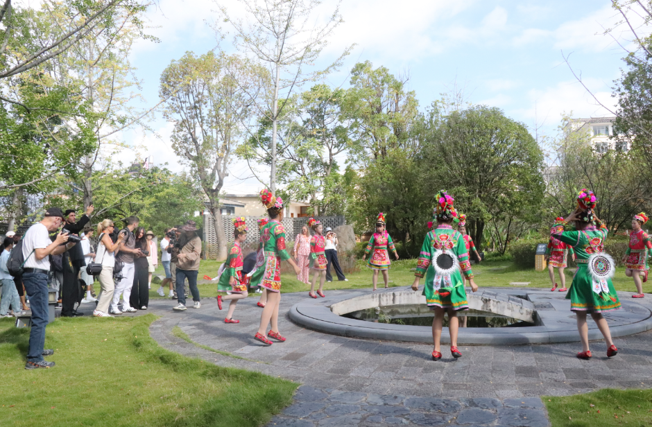 走进文华书院,古朴院落里早已飘来欢快灵动的笛声——一场精彩的巍山彝族打歌展演正等候着采访团。作为“彝族打歌之乡”,巍山的彝族打歌堪称“活态文化瑰宝”,它将传统民俗、审美意趣、技艺巧思、服饰精华与健身娱乐融于一体,是极具民族特色的古老民间歌舞艺术。只见身着绣花头帕、百褶彩裙的彝族群众围成圆圈,踩着“左脚舞”的鲜明节拍,边跳边唱。鲜艳的服饰随舞步翻飞,灵动的舞姿伴着歌声流转,一场极具冲击力的文化盛宴在眼前铺展,让采访团成员沉醉其中。大家纷纷举起手机、相机与摄像机,生怕错过任何一个精彩瞬间。