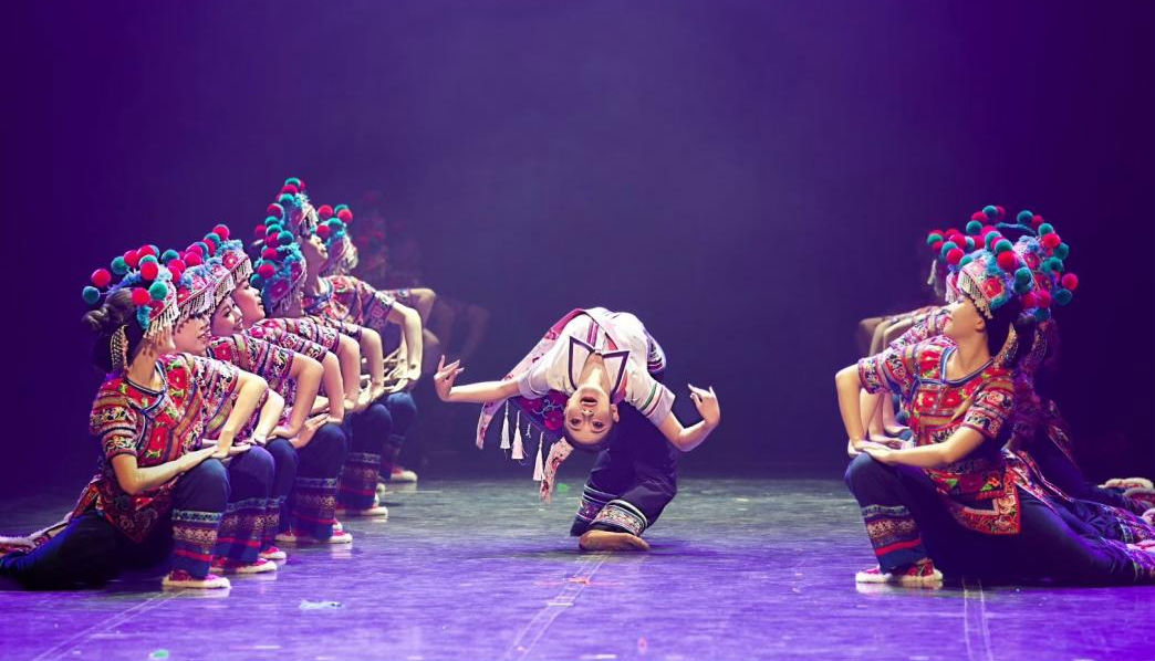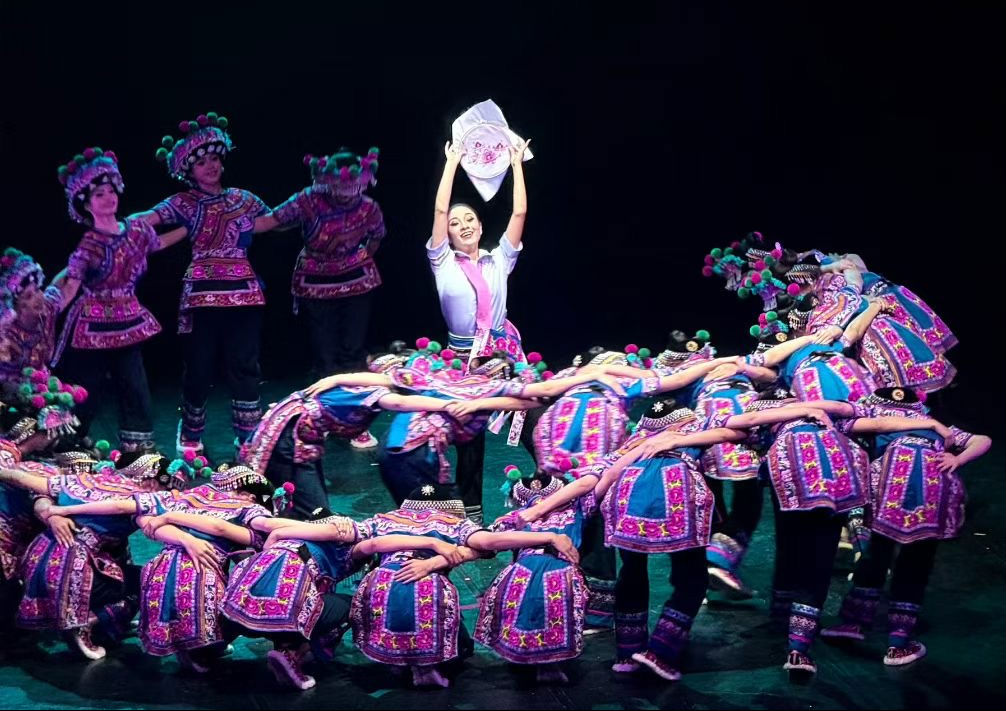群舞《左脚踏出幸福路》以乡村振兴为背景,聚焦牟定彝族妇女的生活图景。25名演员身着彝族传统服饰,以左脚舞的铿锵节奏为引,将彝绣创业的生动实践搬上舞台。舞者们“以布为纸、以线当墨、以针做笔”,在旋转跳跃间展现彝绣技艺的精妙,将民族元素融入产业发展的故事娓娓道来。“背着娃、绣着花、护着老、养着家”的鲜活场景,通过舞蹈与绣品的交织呈现,生动诠释了“文化赋能产业、非遗助力振兴”的时代内涵。