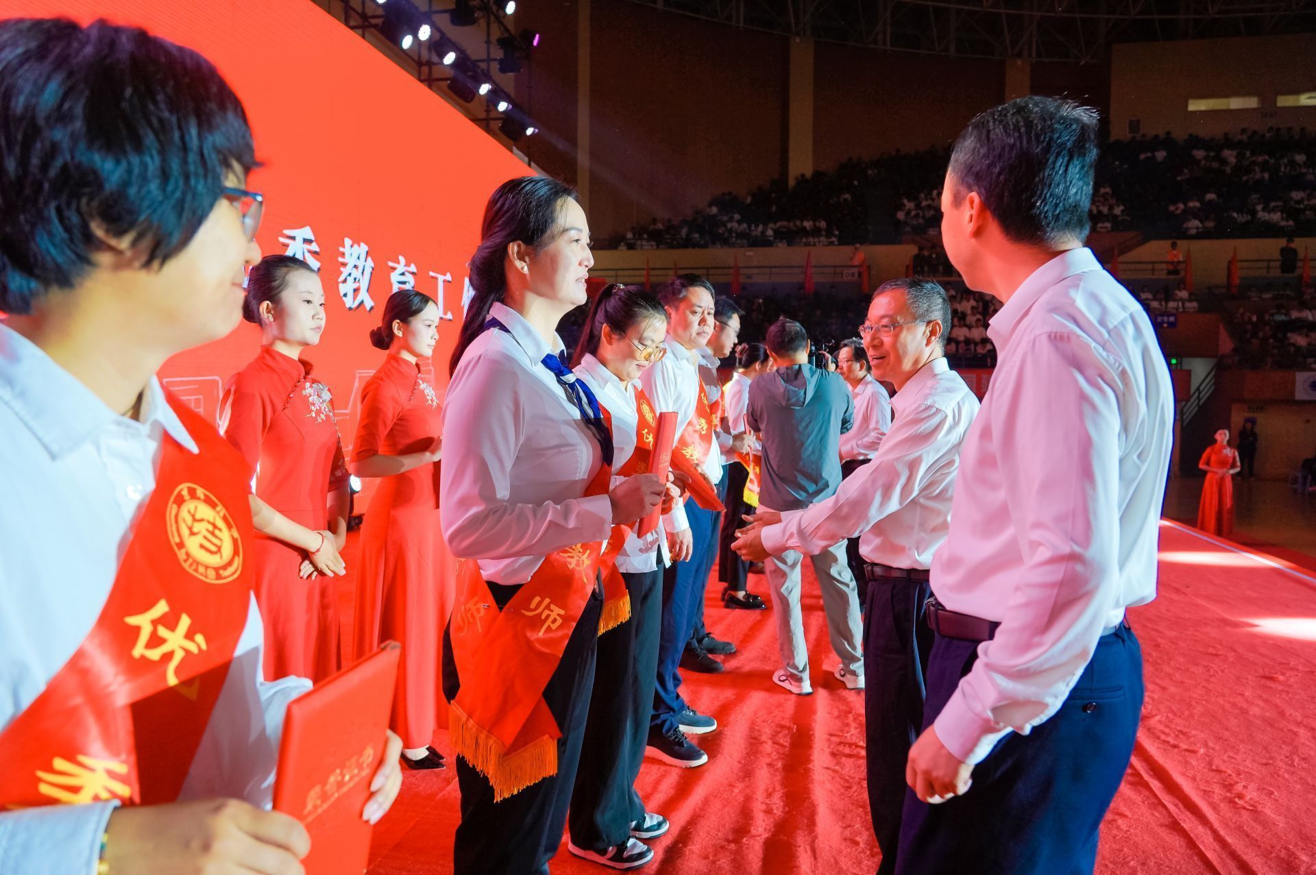 现场还为新生代表佩戴院徽、颁发学生证及学生手册,正式开启新生的校园新身份;工作人员宣读表扬通报后,起雪勇、赵继承、张绍喜、紫文才、金之椰等院领导为“优秀教师”“优秀教育工作者”代表颁奖;28名新入职教师集体宣誓,承诺坚守教育初心。