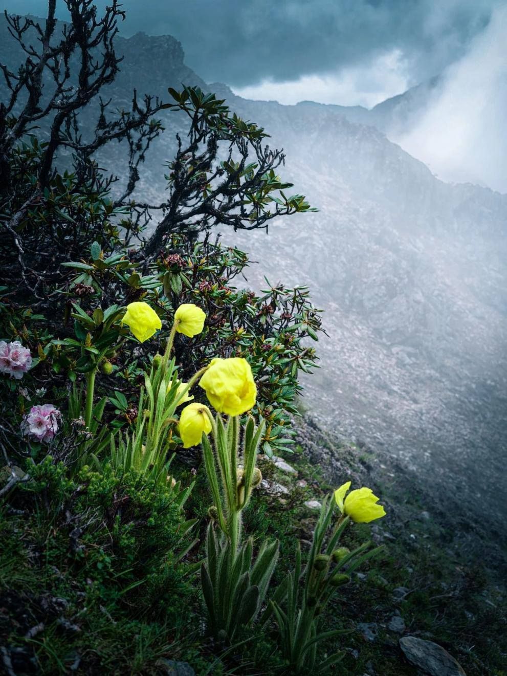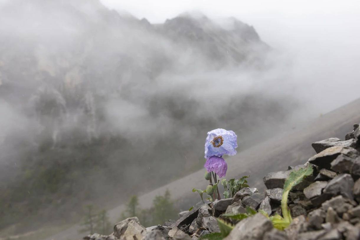 云南是全球生物多样性最丰富的地区之一,从热带雨林到高山草甸,从深谷溪流到喀斯特峰丛,多样的气候与复杂的地形如同天然的“生命实验室”,孕育出无数形态各异、习性独特的生物。就像在高山碎石中绽放的有着“高原美人”之称的绿绒蒿。这种植物偏爱海拔 3000 米以上的冷凉环境,花朵色彩艳丽得如同被阳光吻过——湛蓝如高原湖泊,紫艳似山间云霞,明黄像初升朝阳。轻薄如蝉翼的花瓣上布满细密纹路,在高原的强光照下能最大程度吸收光能,看似娇弱的外表下,藏着与极端环境对抗的智慧。
