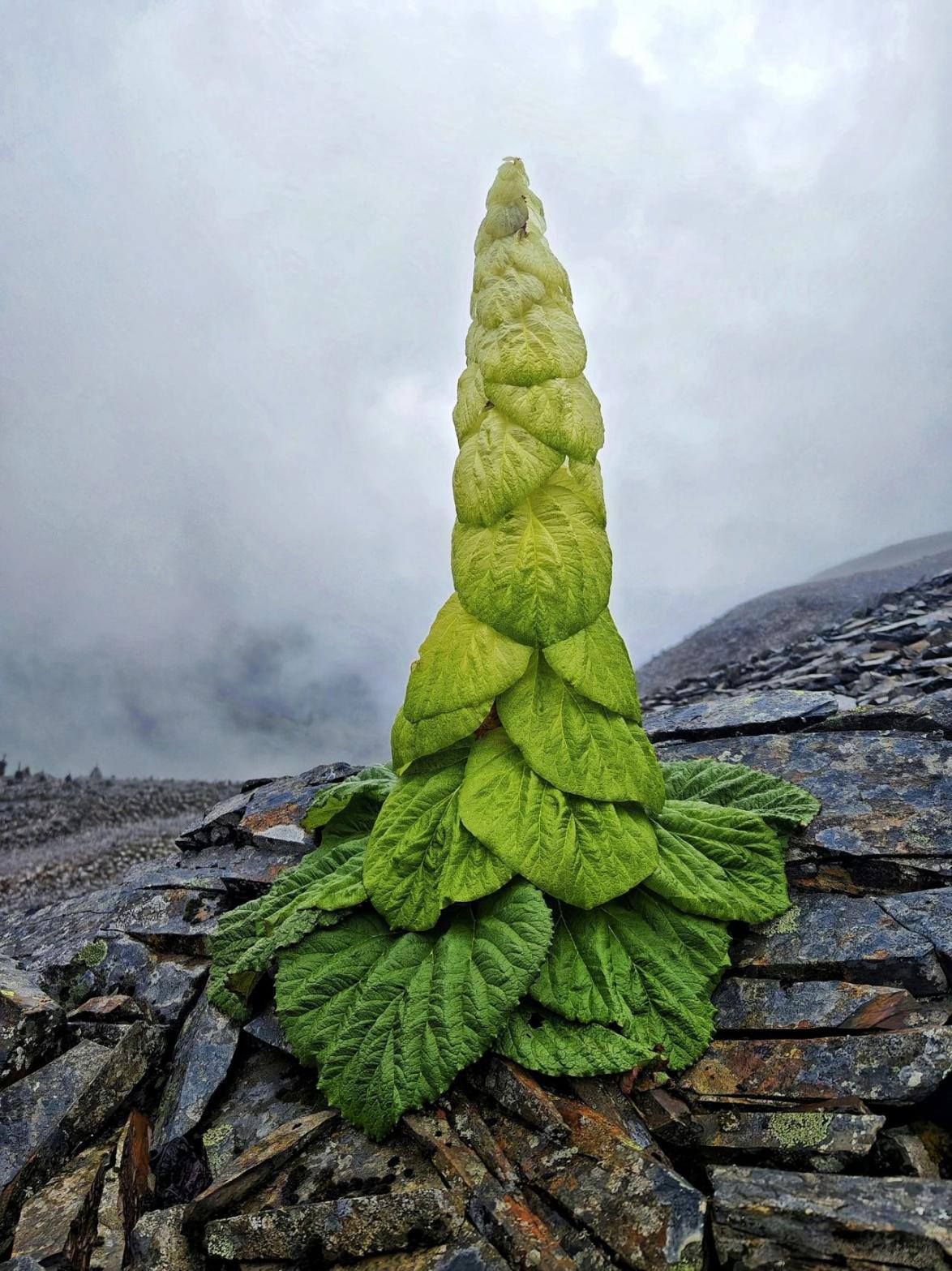 还有那株形似宝塔、叶片层层叠叠的塔黄。它扎根在海拔4000米以上的流石滩,粗壮的茎干如圆柱般向上堆叠,大型的叶片紧紧包裹着中心的花苞,既像古代武士的铠甲,又似一座微型的绿色堡垒。这种独特的形态不仅能储存水分应对干旱,还能在零下低温中减少热量散失,让脆弱的花蕊在严酷环境中安然孕育。当花期到来,外层叶片会逐渐褪去绿色,染上通透的紫红色,远远望去如同荒原上点燃的火炬,在贫瘠的土地上书写着生命的壮阔。