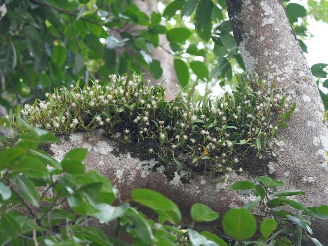 走进雨林深处,大树的枝干上常能见到一簇簇开着小白花的植物,它们是附生兰。这些“雨林精灵”不恋土壤,仅靠根系附着在树皮上,从空气中的湿气里汲取水分,从树皮缝隙的腐殖质中获取养分。细长的叶片呈带状下垂,洁白的小花星星点点地缀在其间,微风拂过便轻轻摇曳,像是在绿色丝绒上撒了把碎雪,为浓密的雨林增添了几分清雅。它们与树木之间并非寄生关系,而是相互成就——兰花开时吸引昆虫前来授粉,无意间也为树木带来了更多生机。