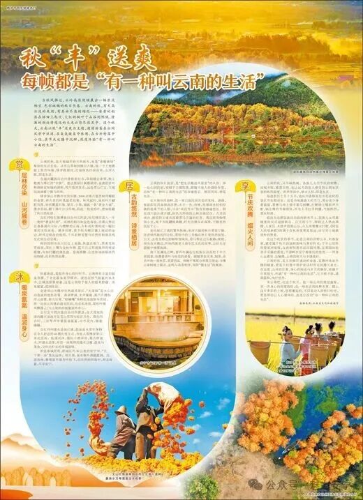 近日,人民日报整版推介“有一种叫云南的生活”,刊发文章《秋“丰”送爽 每帧都是“有一种叫云南的生活”》,文中描绘了云南秋天的绚烂,还提到了秋日泡安宁温泉的惬意。全文如下: