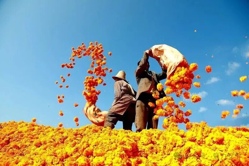 文山壮族苗族自治州丘北县八道哨彝族乡万寿菊喜迎丰收季。马卫忠摄